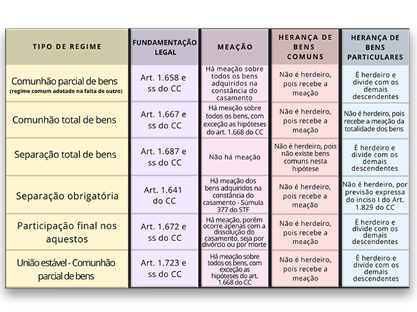 No momento de habilitar-se oficialmente para o casamento no cartório será necessário escolher o regime de bens que o seu casamento vai seguir, assim, na tabela abaixo há um resumo dos principais pontos que vão servir de base para os direitos e obrigações decorrentes do matrimônio na sucessão.